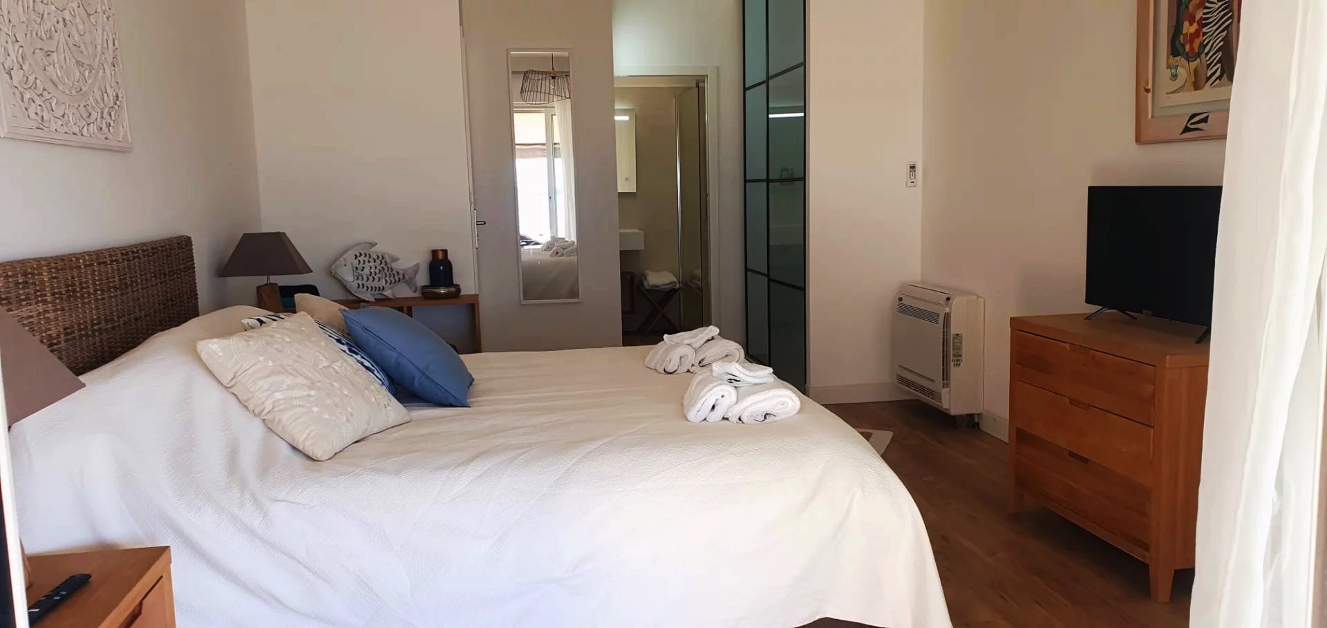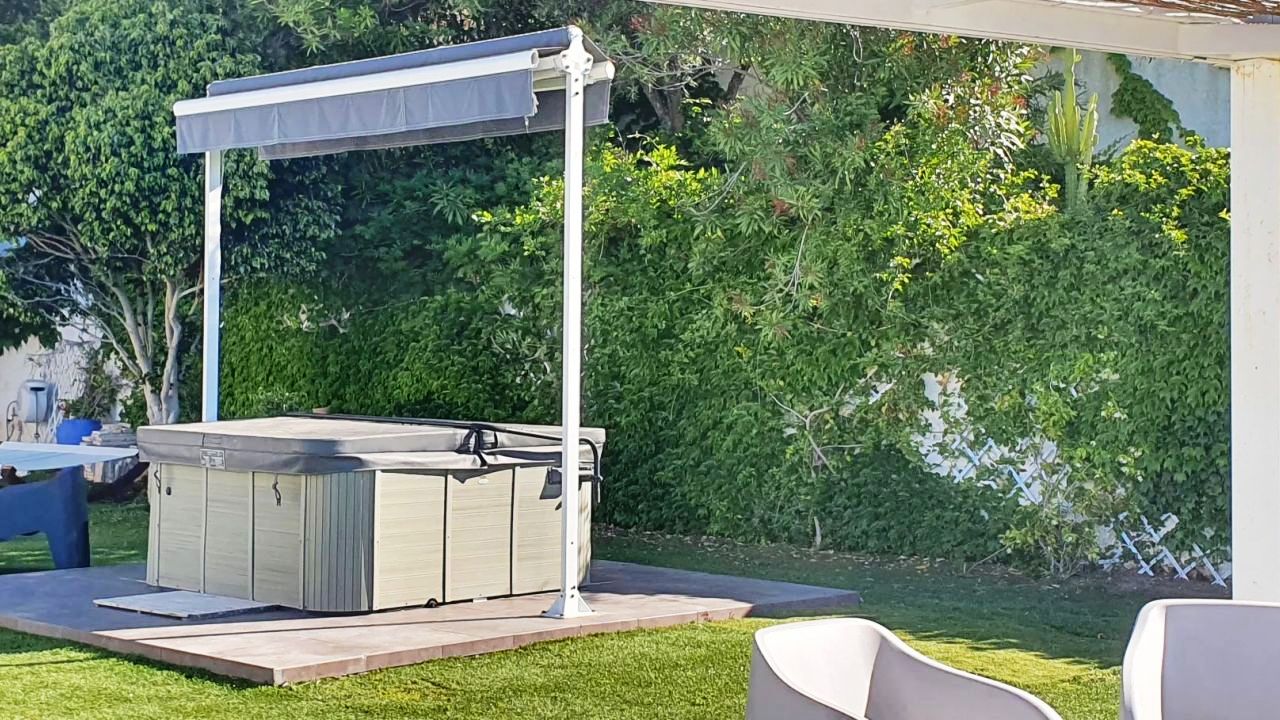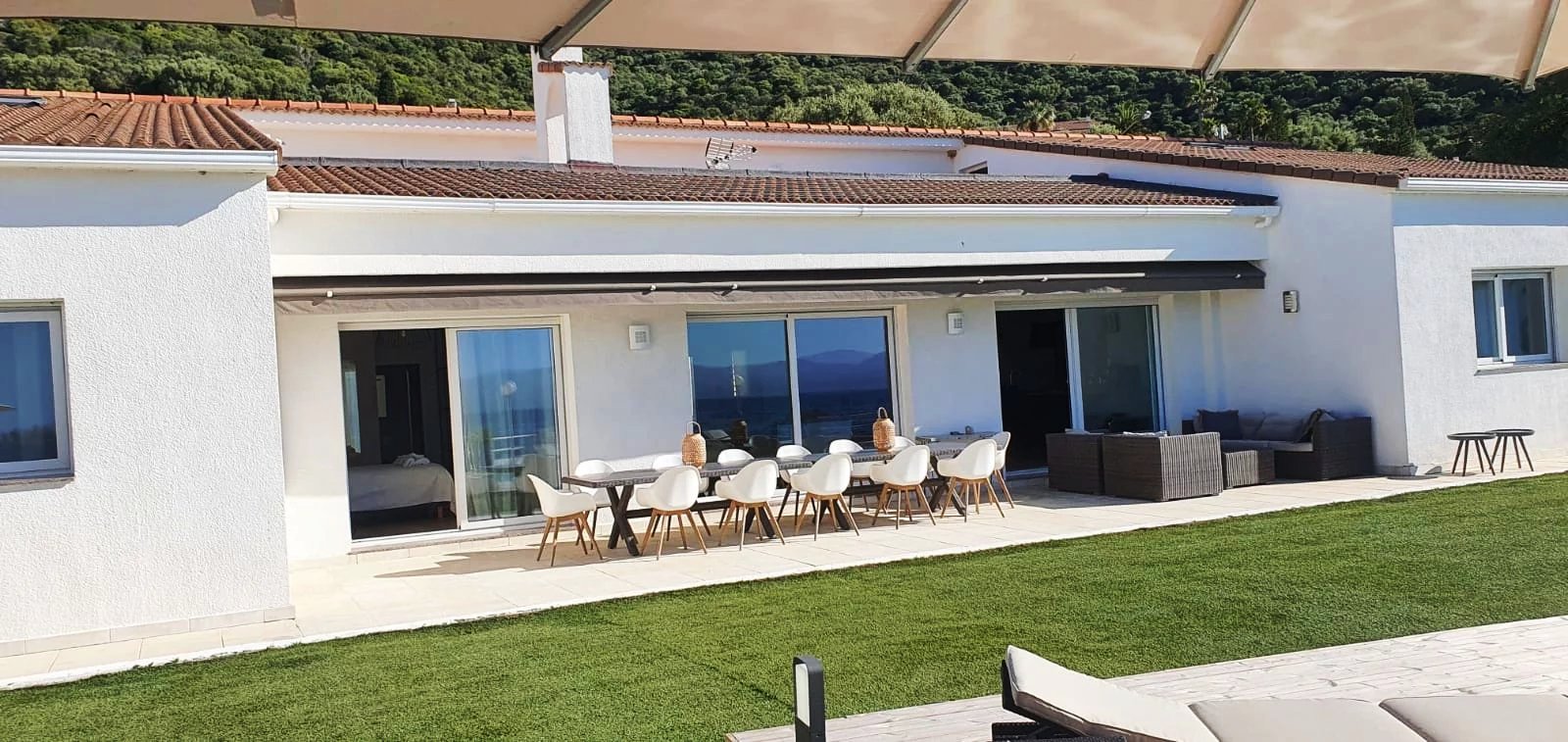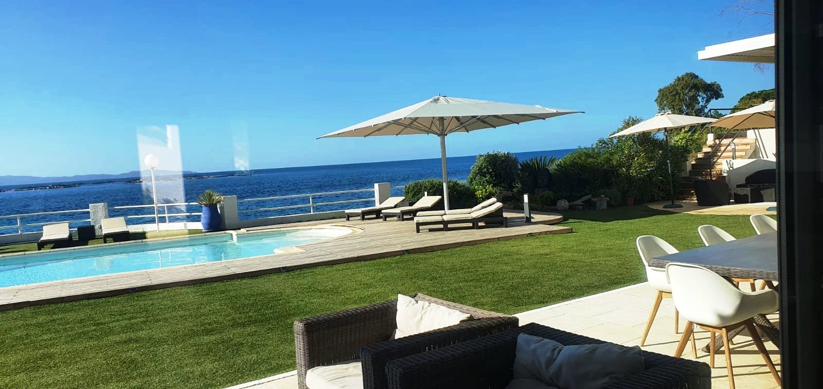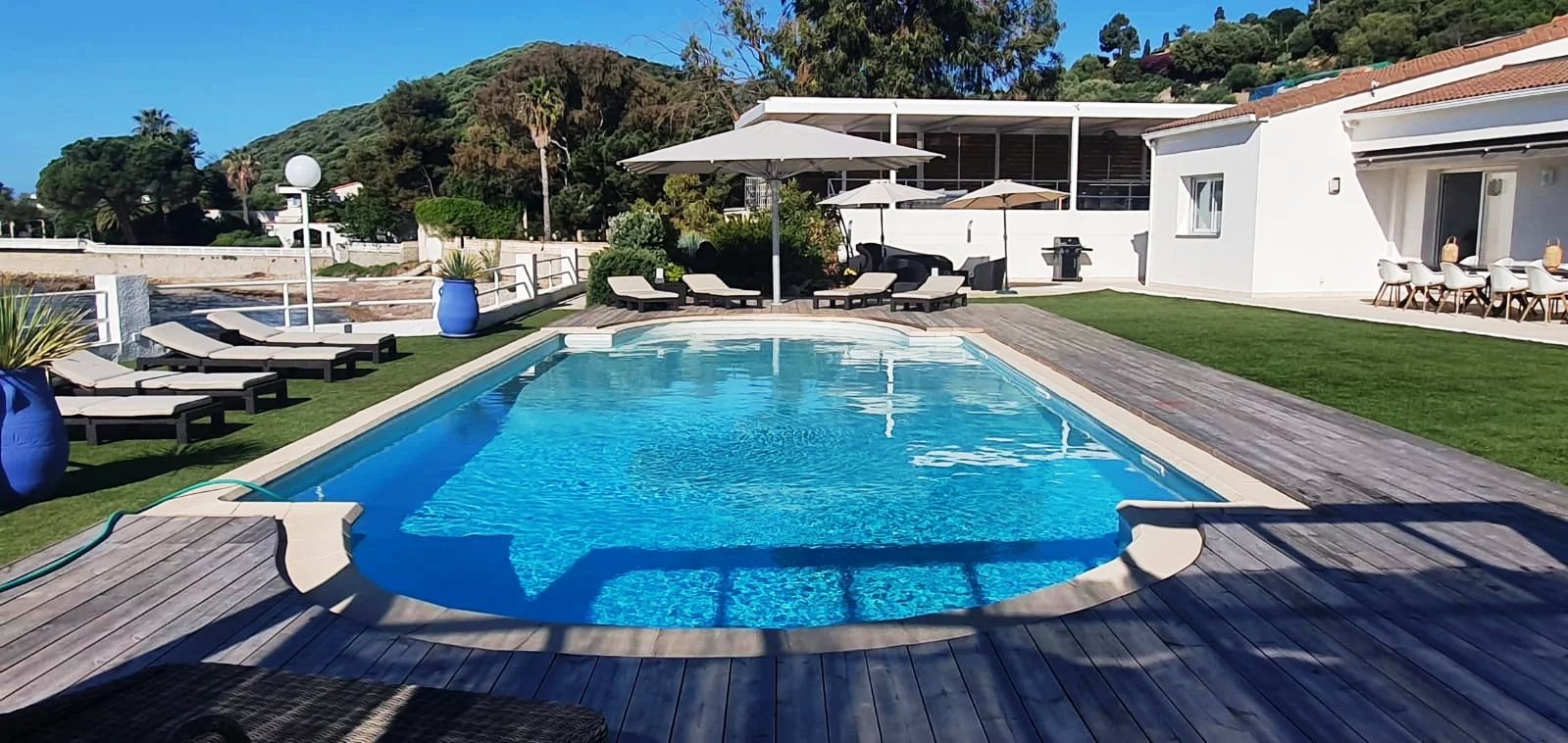 La piscine fait face à l'horizon marin. Un grand garage bateau d'environ 120 m² prolonge la relation à la mer. Une maison de gardien indépendante, un garage voiture et un solarium complètent l'ensemble. Climatisation, cheminée, arrosage automatique, portail électrique, éclairage extérieur : chaque détail a été pensé pour un usage aussi bien résidentiel que saisonnier.