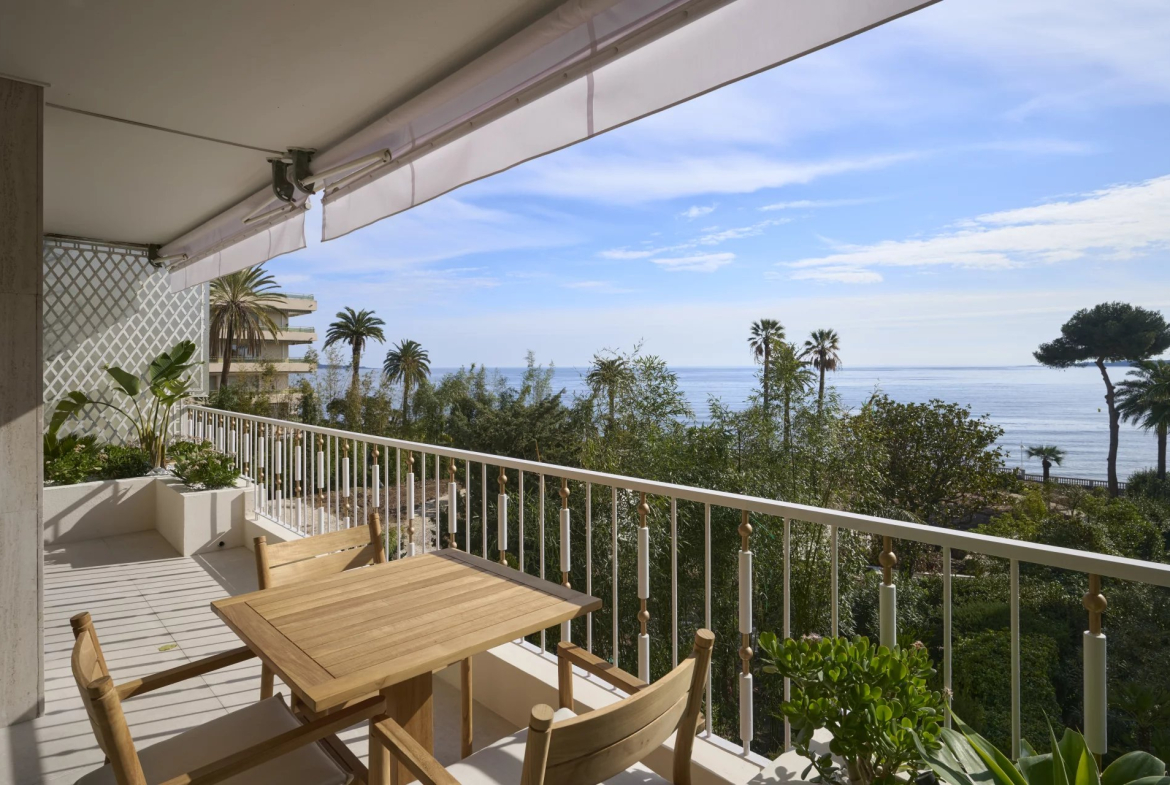 Appartement 100 m² à Cannes Palm Beach, vue mer, accès direct à la mer depuis la copropriété, 3 chambres en suite, terrasse 18 m², parking et cave.