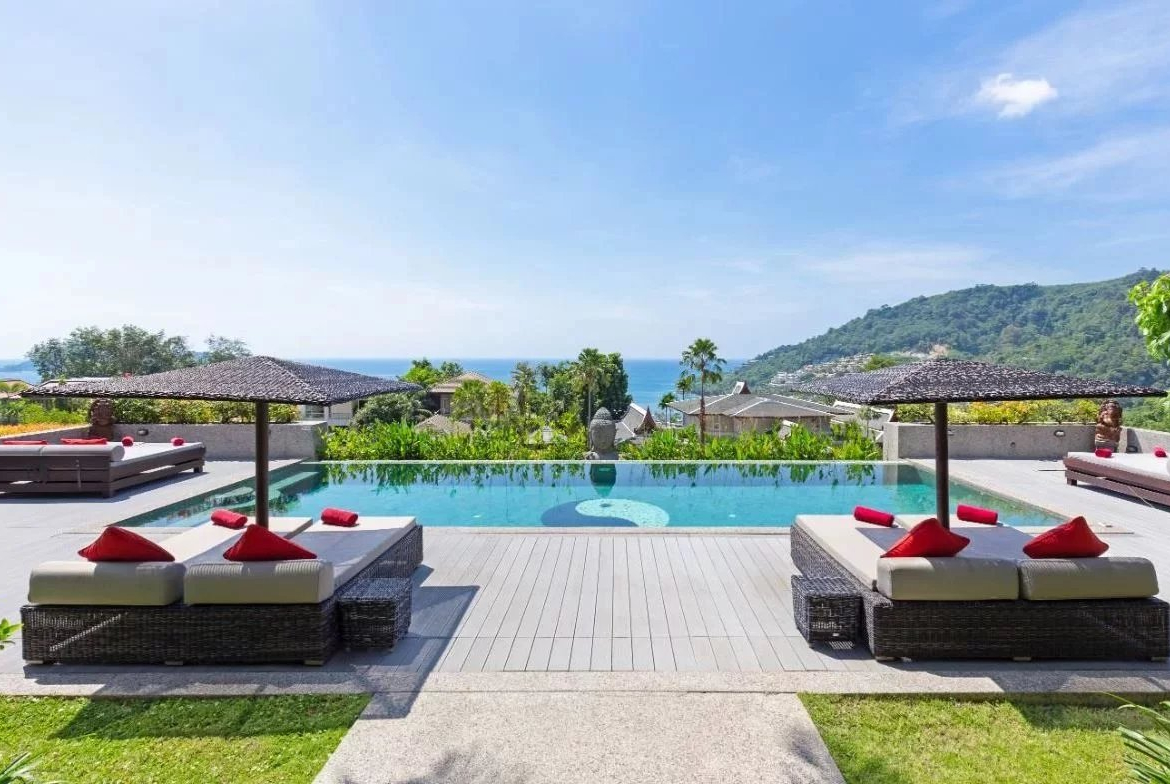 Villa de luxe style thaï-balinais 750 m² à vendre à Patong Kathu, Phuket, Thaïlande. Terrain 4 800 m², 8 chambres king-size, piscine à débordement, spa, hammam, sauna, vue côte ouest.