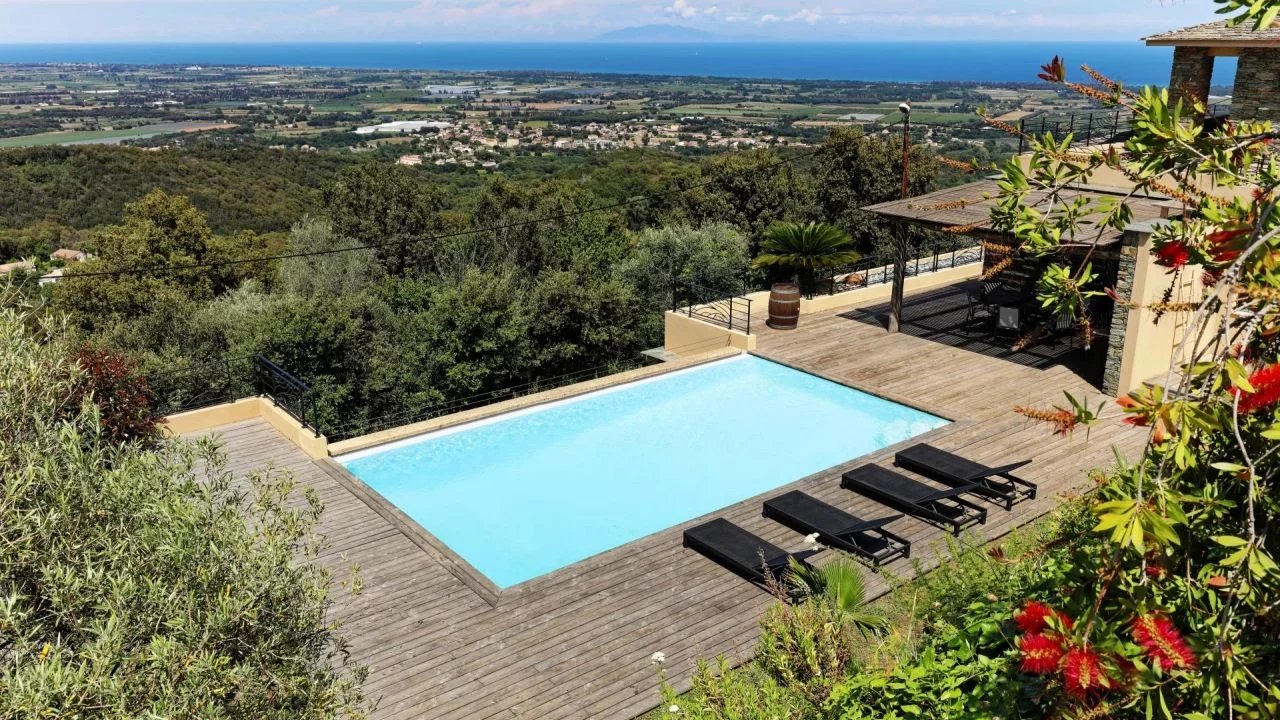 Villa contemporaine en pierre 250 m² à vendre à Sorbo-Ocagnano, Casinca, Haute-Corse. Terrain 2 413 m², 4 suites avec terrasses, piscine 10×5 m, vue panoramique mer jusqu’aux îles toscanes.