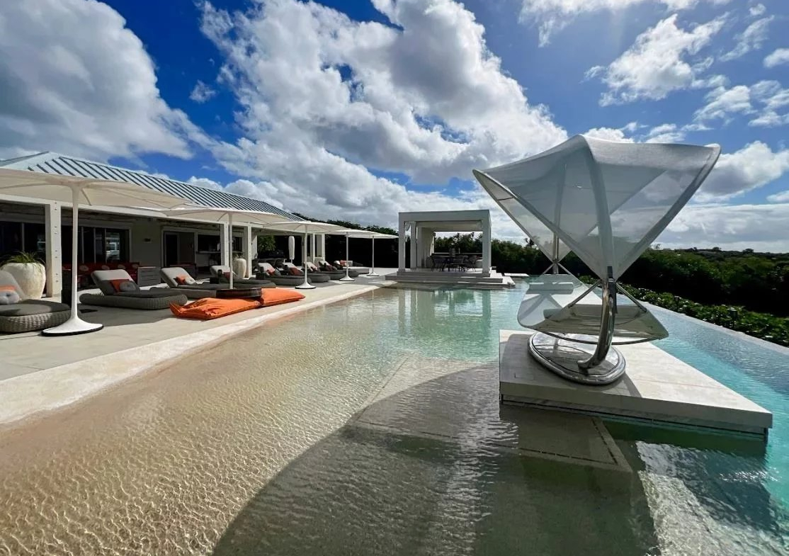 La piscine en forme de L, entourée de chaises longues et de lits de jour, est équipée d’un bar intégré et d’un îlot pour se prélasser. L’intérieur de la villa, décoré dans un style contemporain d’inspiration africaine, propose des meubles Manutti et Roche Bobois, des œuvres d’art primitives et des touches de bois naturel. Un salon élégant, une salle à manger raffinée et un coin télévision avec un Smart TV de 82 pouces complètent l’espace.