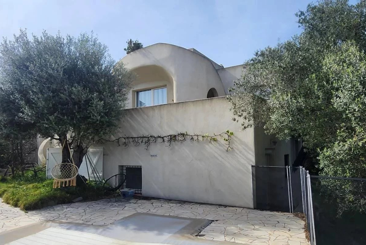 Conçue dans les années 1990 par un architecte, la villa épouse le relief naturel et capte la lumière à travers de larges ouvertures. Elle développe environ 216 m² répartis sur plusieurs niveaux et comprend :
