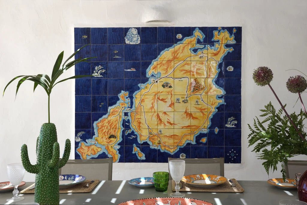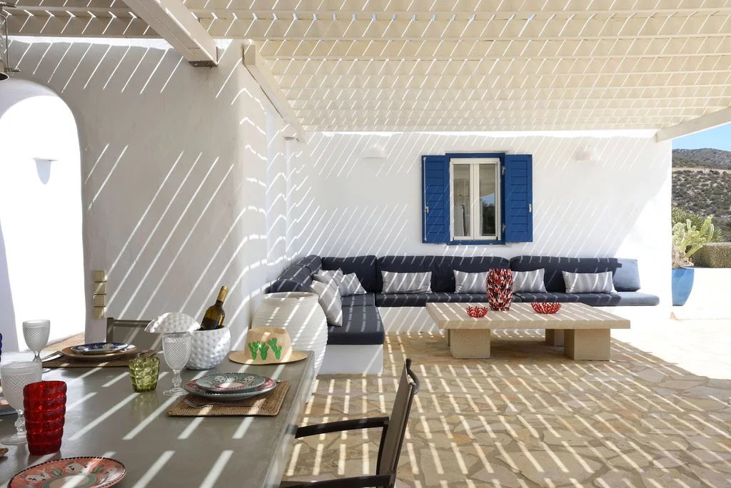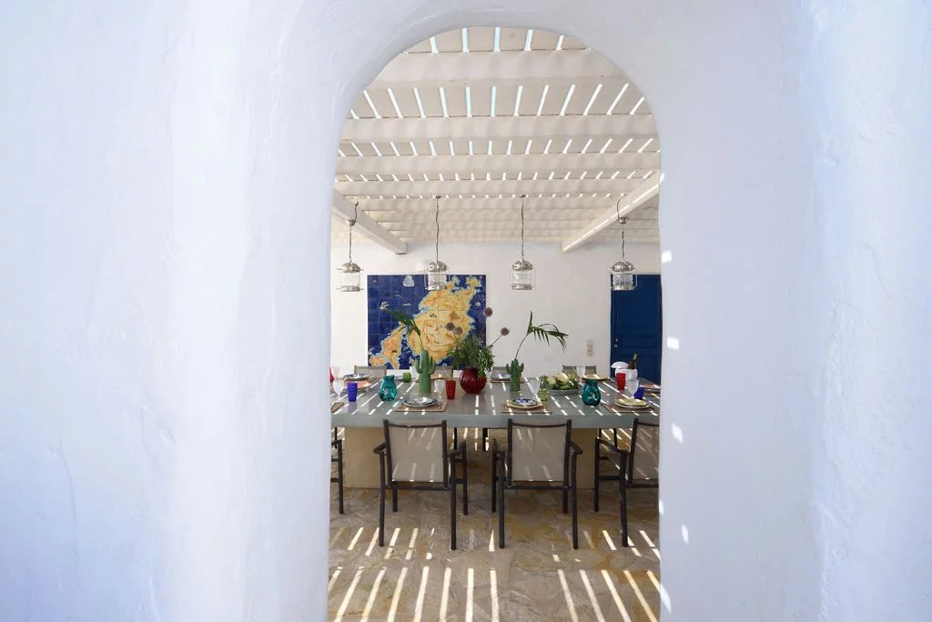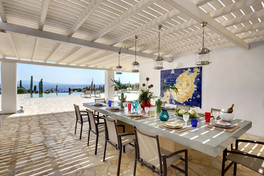 Une majestueuse salle à manger extérieure accueille jusqu’à 16 convives, à quelques pas seulement de la plage de Faraggas.