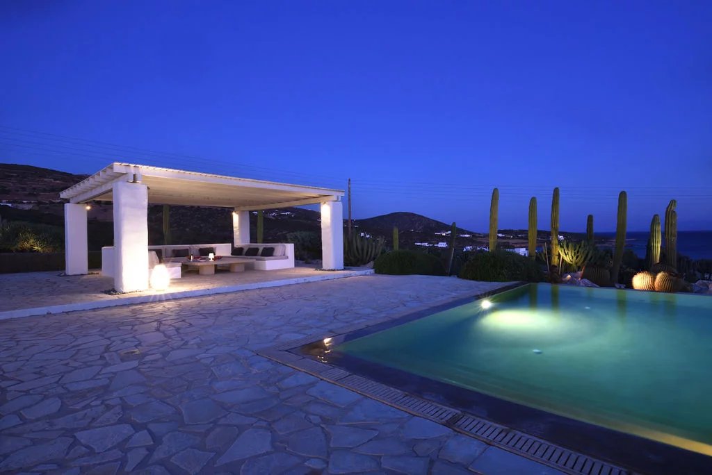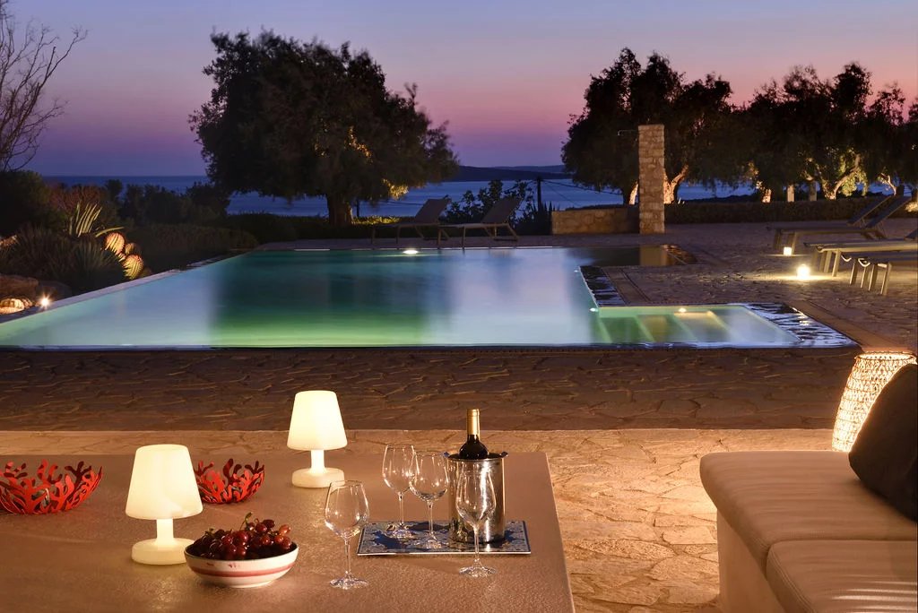 Somptueuse villa à Faraggas, Paros : 550 m², 8 suites, piscine à débordement, vue panoramique sur la mer Égée. Un luxe rare en harmonie avec la nature.