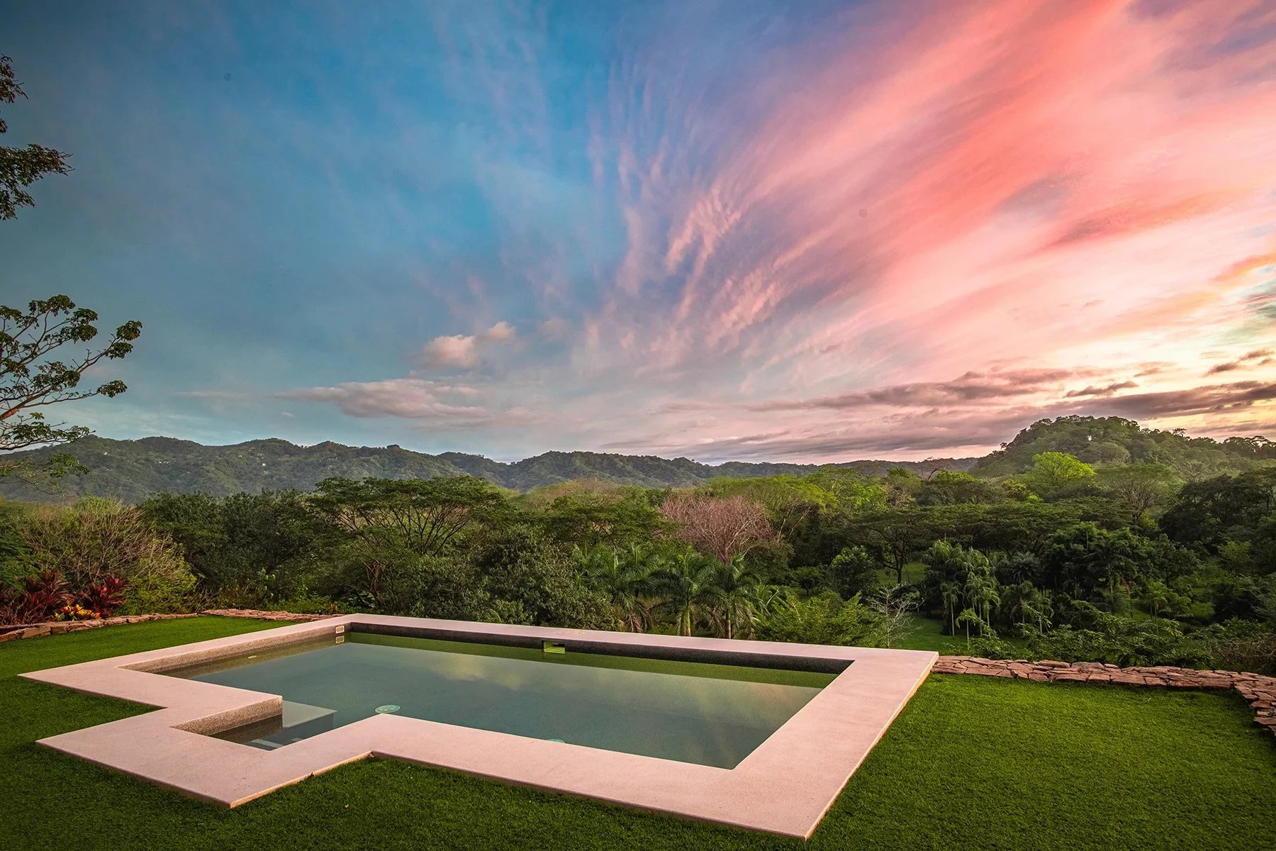 Domaine de 16 hectares à vendre à Nosara, Costa Rica. Villa 142 m², 2 chambres, piscine, 9 000 arbres, cascade, autonomie solaire complète, potentiel de développement. Vue montagnes.